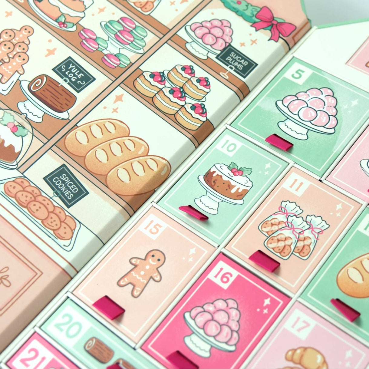 Inside, the design opens to reveal shelves of holiday cakes, breads, and sweets, with 24 numbered drawers each decorated with its own bakery-inspired illustration. The box is sturdy, house-shaped, and crafted to be both delightful to open and display throughout the season.