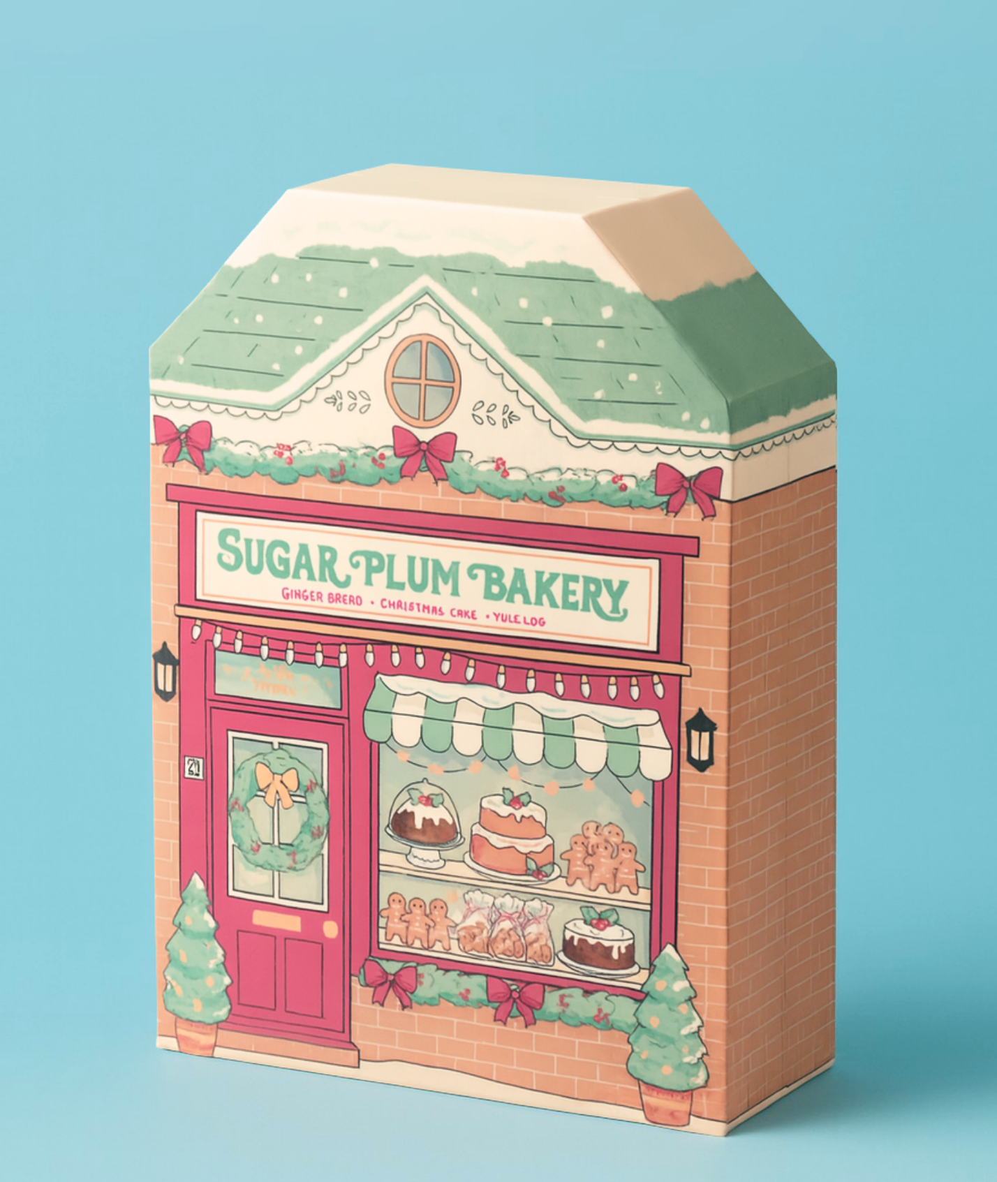 The exterior features a snow-dusted roof, holly garlands, and a welcoming bakery window filled with Christmas treats, tied together with satin ribbon closures for an elegant finish.