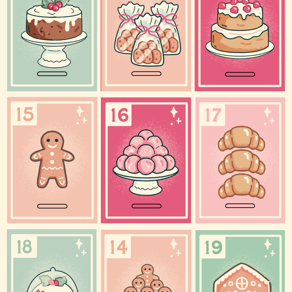 Inside, the design opens to reveal shelves of holiday cakes, breads, and sweets, with 24 numbered drawers each decorated with its own bakery-inspired illustration. The box is sturdy, house-shaped, and crafted to be both delightful to open and display throughout the season.