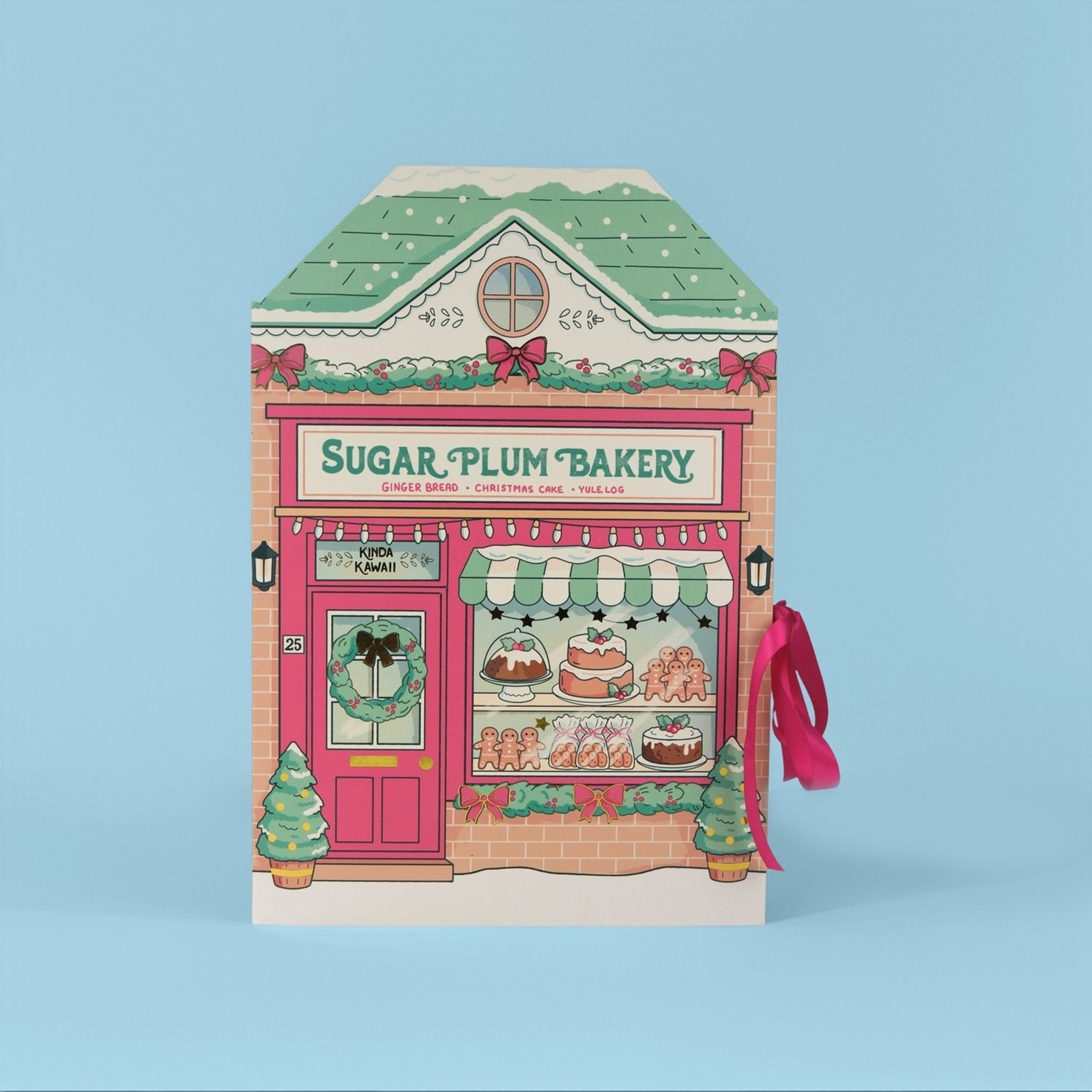 The exterior features a snow-dusted roof, holly garlands, and a welcoming bakery window filled with Christmas treats, tied together with satin ribbon closures for an elegant finish.